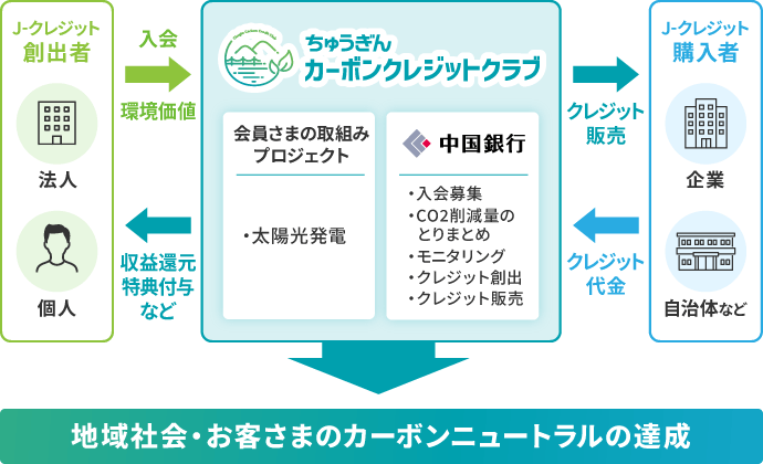 ・当行は太陽光設備等の環境に配慮した設備の普及を後押しするとともに、同設備から創出された環境価値をクレジット化し、当行のお取引のある需要家さまに販売することで地域社会・お客さまのカーボンニュートラル達成に貢献いたします。