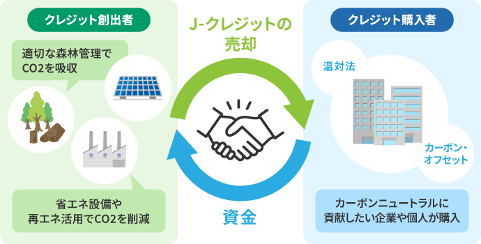 J-クレジット制度とは、省エネルギー設備の導入や再生可能エネルギーの利用による温室効果ガス(CO2)等の削減量や適切な森林管理によるCO2等の吸収量を「クレジット」として国が認証する制度です。認証されたクレジットを売買することができ、カーボンニュートラル行動計画の目標達成やカーボン・オフセットなど、さまざまな用途に活用できます。 環境への配慮が求められる昨今、地球温暖化対策に関する国の重要施策の一つです。