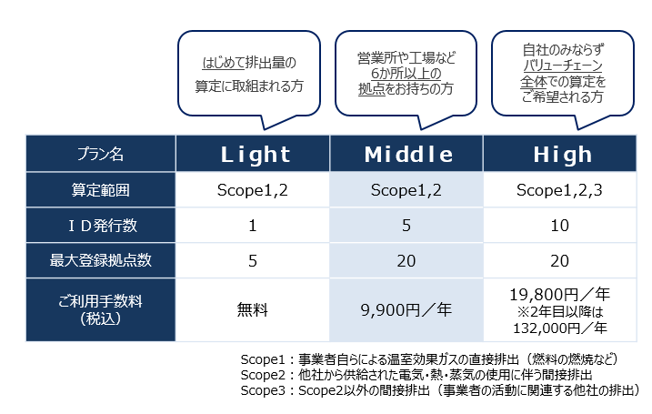 CO2排出量算定に関するお客さまのニーズに応じて、3種類のプランを用意しております。