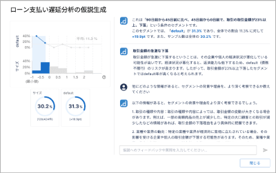 生成AIが分析結果の読み解きを支援します。AIに業務知識をフィードバックしながら、対話的に仮説を立て、ビジネスの戦略や改善施策の立案が可能です。
