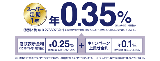対象となるお客さま | キャンペーン期間中にスーパー定期を新規にお預入れいただいた個人・法人のお客さま ※ 自動継続扱いに限ります。 ※ すでにお預入れいただいている定期預金の満期資金、解約金等による預替えは対象外です。 |