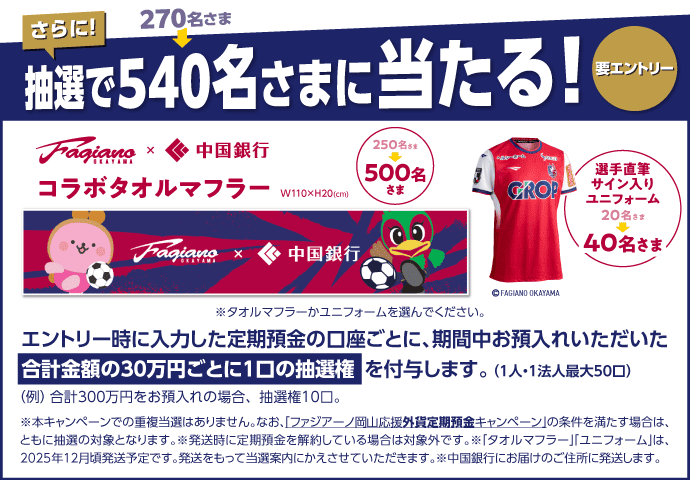 「ファジアーノ岡山応援定期預金キャンペーン」につきまして、募集総額が300億円に達しましたが、ご好評につきプレゼントの当選者を増やして10月31日まで継続します。