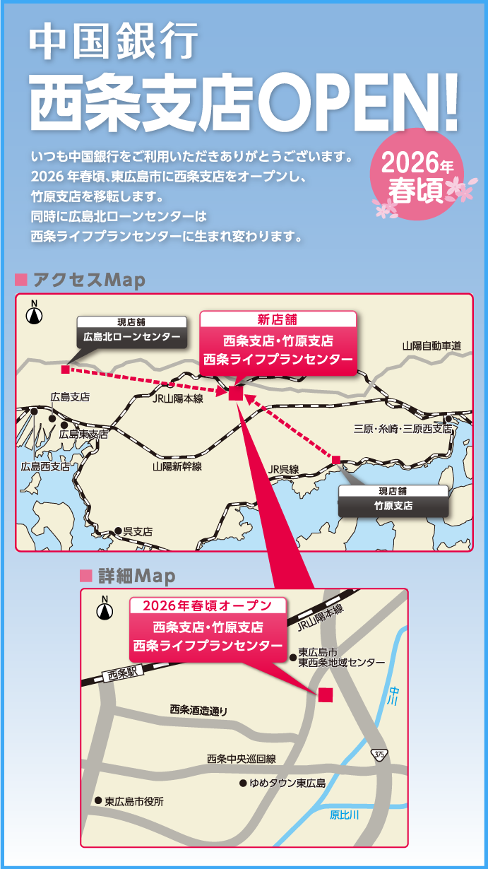 新店舗開設を記念して、広島県内の窓口限定で定期預金の金利上乗せキャンペーンを実施いたします。