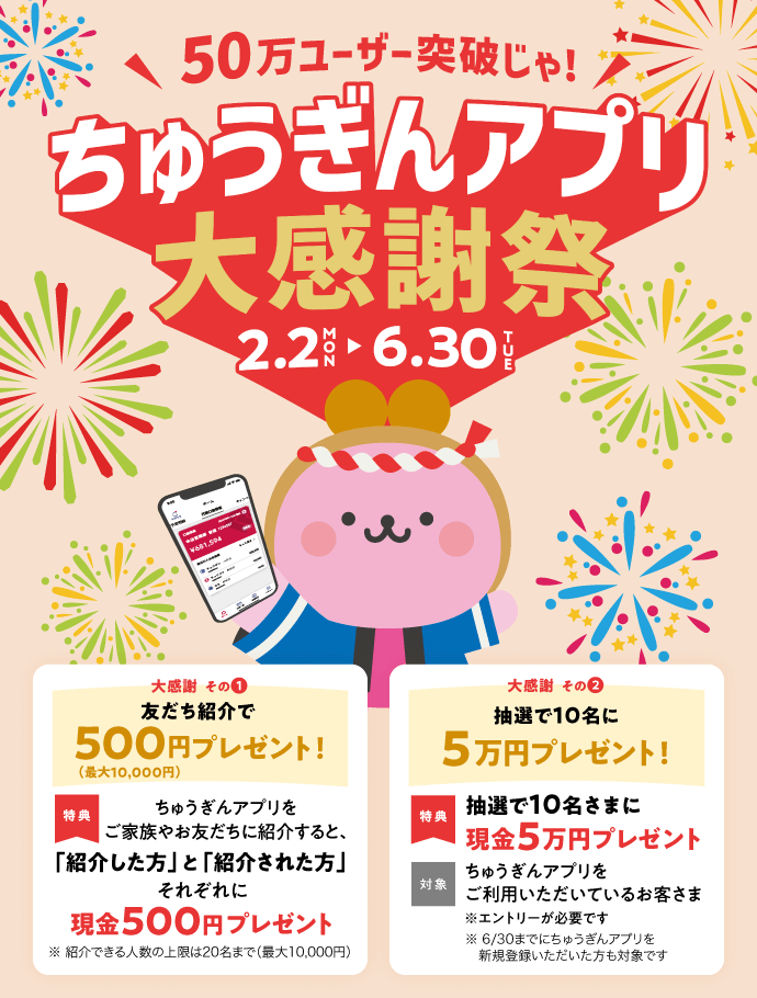 「50万ユーザー突破じゃ!ちゅうぎんアプリ大感謝祭」開催について