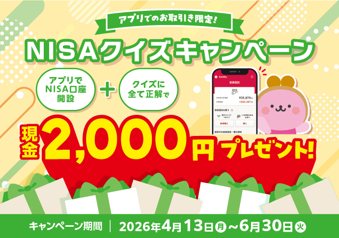 | 対象者 | 期間中に、ちゅうぎんアプリでNISA口座を開設、かつ、NISAに関するクイズ(3問)にすべて正解されたお客さま ※ NISAクイズはWeb上の専用ページからご回答ください。 |