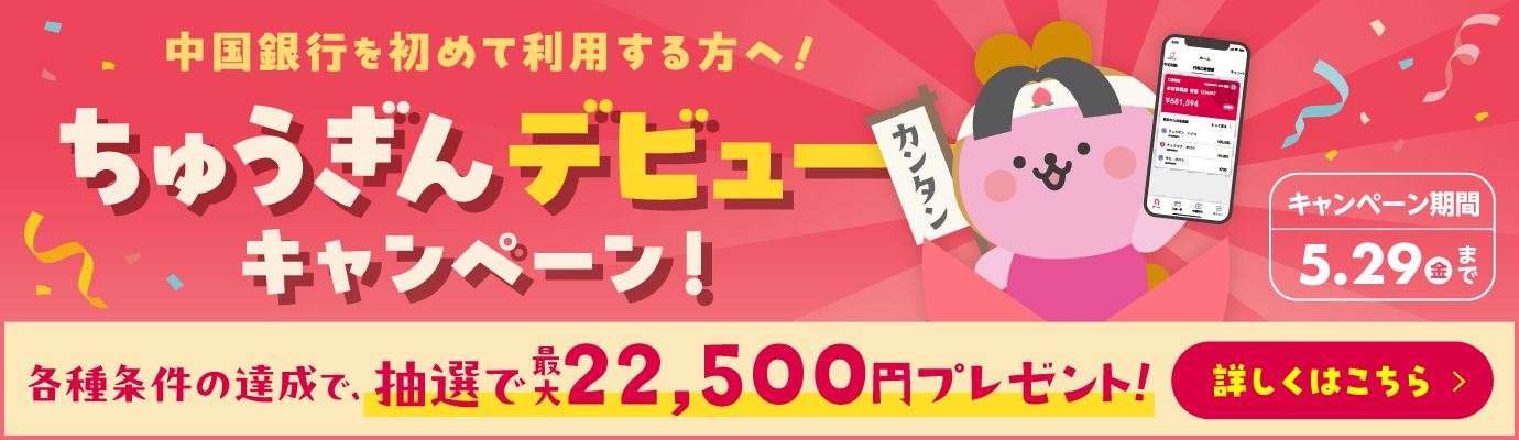 - 普通預金口座の紙通帳は発行しません。ちゅうぎんアプリをご利用ください。