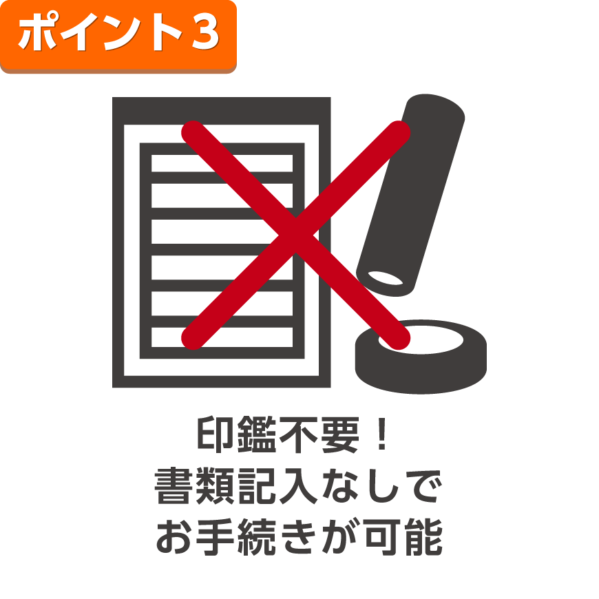 - お手続きはWEBの入力画面への入力ですべて完結しますので、印鑑不要・お申込み書類の記入は不要です。