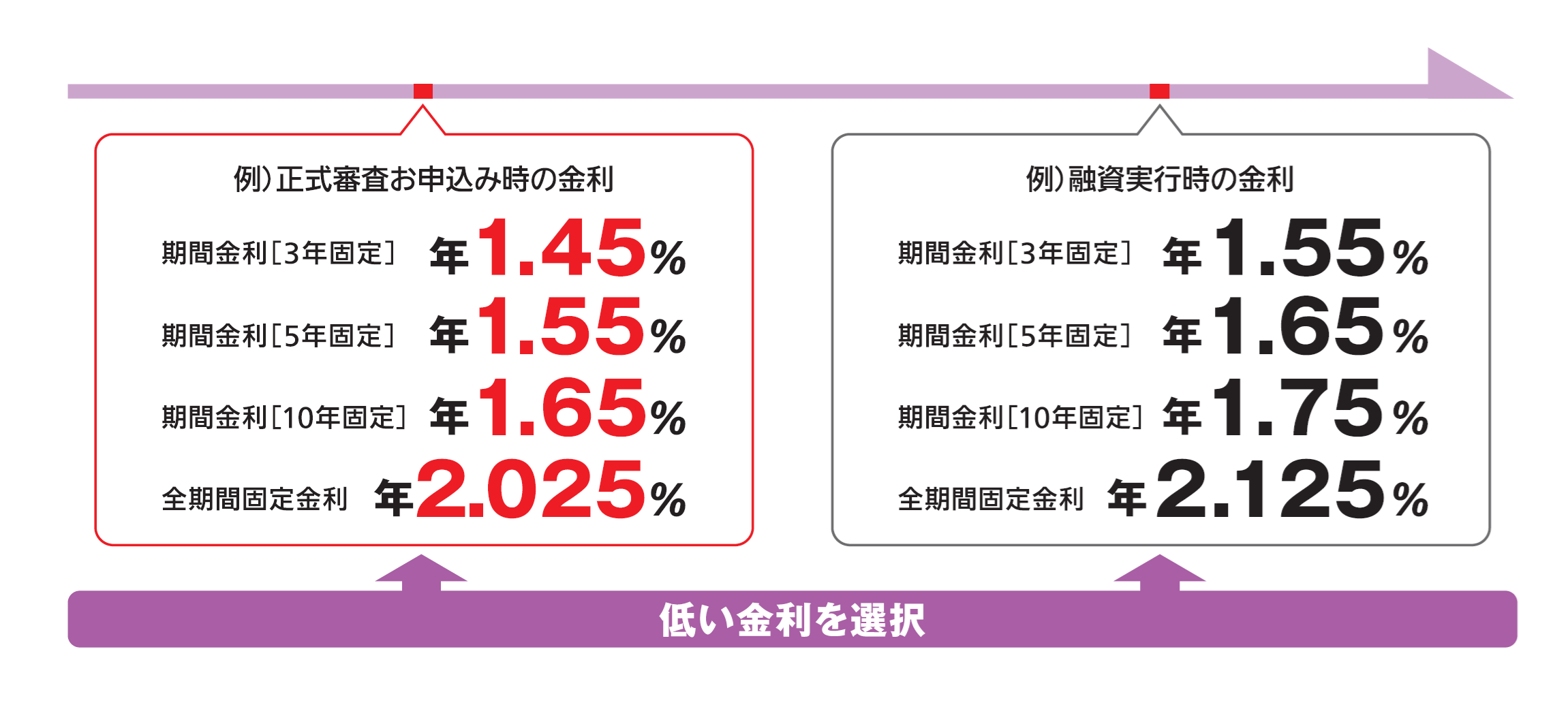 「正式審査お申込み時の金利」、「融資実行時の金利」のいずれか低い金利をお選びいただけます。