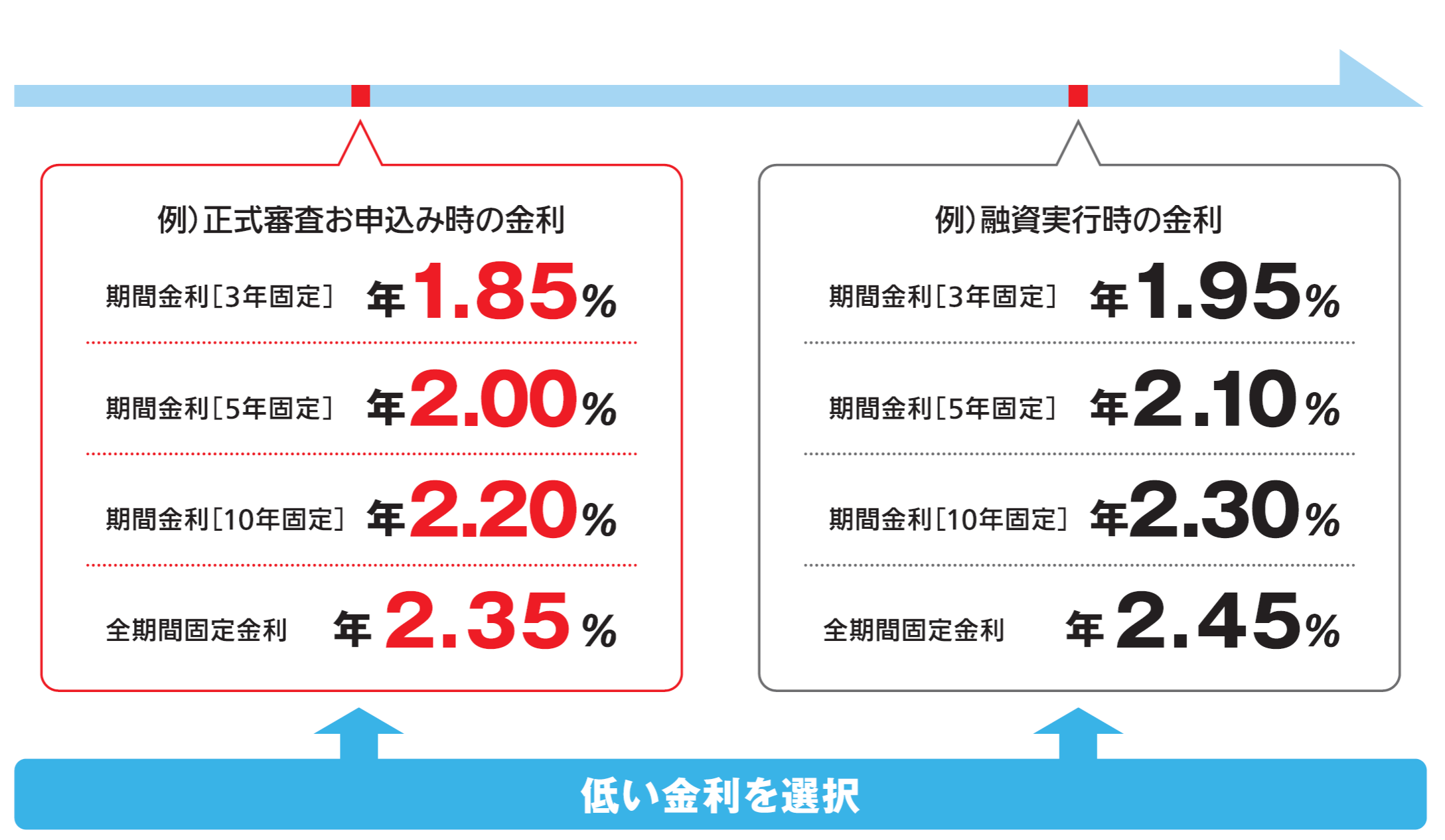 「正式審査お申込み時の金利」、「融資実行時の金利」のいずれか低い金利をお選びいただけます。