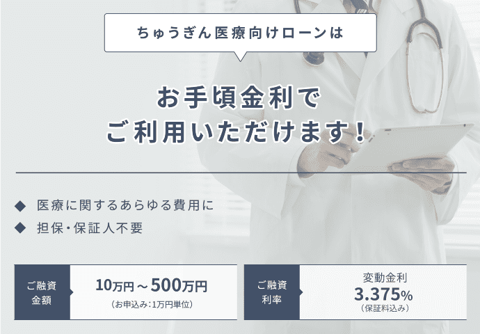 ちゅうぎん医療向けローンは、病気やケガの治療、手術費用、入院費用、インプラントや歯列矯正等歯科治療費用など、医療に関するさまざまなお使いみちにご利用いただけます。