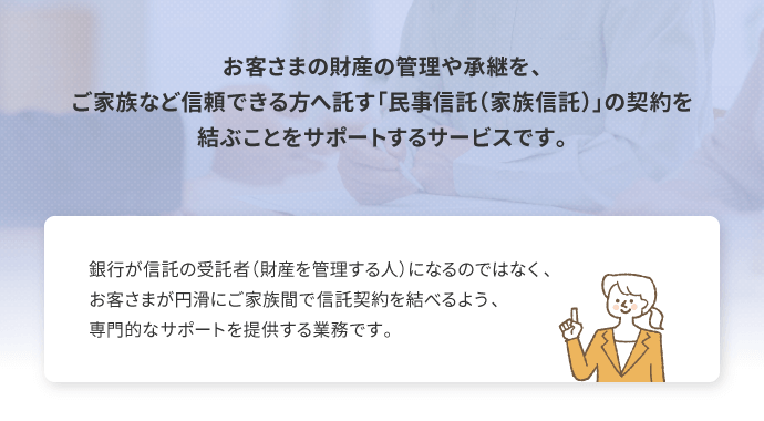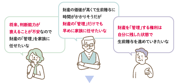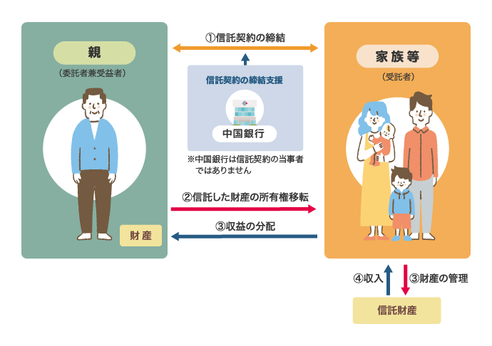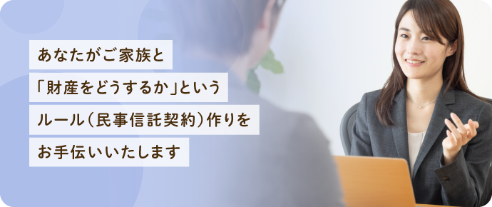 お客さまのご要望に合わせ、「財産を誰に、いつ、どのように引継ぐか」といった具体的な民事信託の設計(スキーム)を提案します。