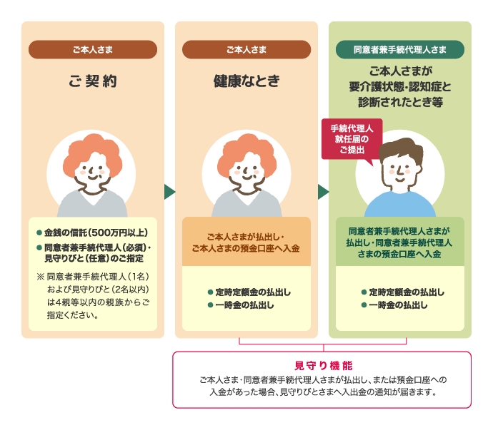健康なときには「ご自身」で、要介護状態・認知症と診断されたとき等には「同意者兼手続代理人さま」により引出しをおこなえます!
